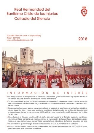 A partir del lunes día 26 de febrero se recibirá en los domicilios de los hermanos el tríptico que servirá para la recogida de la vela y la revista Silencio; el reparto comenzará el miércoles día 28 de los corrientes en la Funeraria La Soledad, en horario de mañana de lunes a viernes, y continuará hasta el miércoles Santo día 28 de marzo.