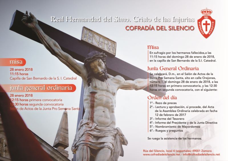 En sufragio por los hermanos fallecidos, a las 11:15 horas del domingo 28 de enero de 2018, en la capilla de San Bernardo de la S.I. Catedral.