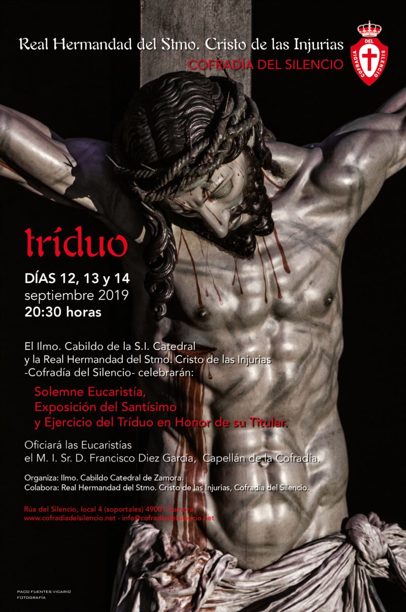 El Ilustrísimo Cabildo de la S.I. Catedral y la Real Hermandad del Stmo. Cristo de las Injurias – Cofradía del Silencio – celebrarán Solemne Eucaristía, Exposición del Santísimo y Ejercicio del Triduo en honor de su Titular, los días 12, 13 y 14 de septiembre de 2019 a las 20:30 horas en la Santa Iglesia Catedral.
