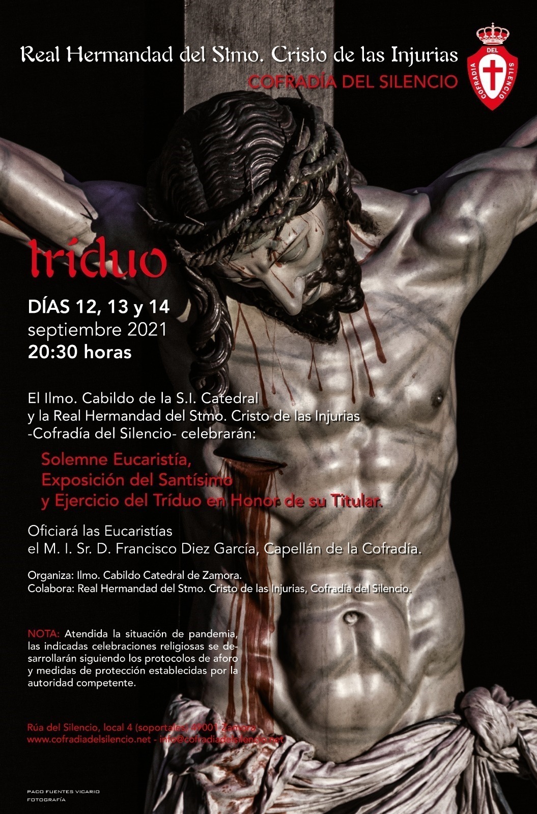 El Ilustrísimo Cabildo de la S.I. Catedral y la Real Hermandad del Stmo. Cristo de las Injurias – Cofradía del Silencio – celebrarán Solemne Eucaristía, Exposición del Santísimo y Ejercicio del Triduo en honor de su Titular, los días 12, 13 y 14 de septiembre de 2021 a las 20:30 horas en la Santa Iglesia Catedral.